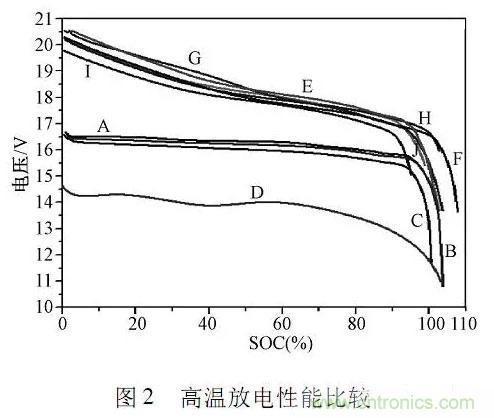 高溫情況下,電池內(nèi)部離子移動速度增大,濃差極化和電化學極化減輕,極化內(nèi)阻減小,電池內(nèi)部化學反應熱增大,過分高溫會使隔膜發(fā)生收縮,電解液發(fā)生副反應,造成電池壽命穩(wěn)定性降低GB/T31486要求電池在室溫下充滿電,55℃高溫下儲存5h后評價動力電池的放電容量電池樣品的高溫放電性能比較如圖2所示。