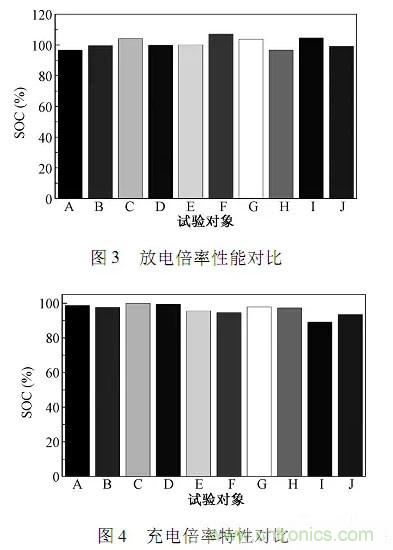 GB/T31486以動力電池在3C電流強度放電來考核其放電倍率;以2C電流強度充電,且充電時長控制在30min內(nèi),來考核電池的充電倍率特性。放電倍率特性對比如圖3所示;充電倍率特性對比如圖4所示。