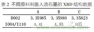 表2是不同原料制備人造石墨的XRD結構數據,由數據可知:A、B、C三種材料的D002值依次減少,說明三種材料的石墨化程度依次升高;I004/I110值依次升高,說明三種材料的取向性依次變差。這與原料的偏光測試結果是一致的。取向性好的材料嵌鋰的速度更快。
