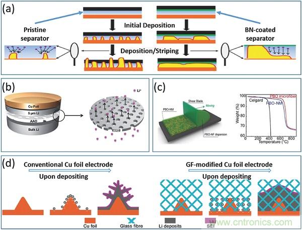 常規(guī)的非織造聚合物或微孔隔膜太脆弱以至于不能抵抗枝晶,對(duì)鋰沉積行為沒(méi)有顯著影響。這里開(kāi)發(fā)了改進(jìn)的中間層,以進(jìn)一步保證電池的性能,這主要是通過(guò)與枝晶或鋰離子通量的相互作用。這里,中間層具有不同的功能,包括專(zhuān)門(mén)設(shè)計(jì)的分離器或附加的保護(hù)層,以彌補(bǔ)分離器的弱點(diǎn)。