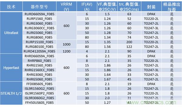 安森美半導體量產的汽車級高壓整流器包括600 V、1000 V和1200 V的產品,電流從4 A至80 A,提供DPAK、TO220和TO247等多種封裝選擇。