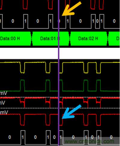 現在我們聚焦數據段,第一個字節數據相同,均為為00H;第二個字節數據不同,分別為01H、02H。圖5箭頭標示處可以看到兩者對應位的邏輯分別為0和1。前面我們提到CAN節點在發送報文的同時會檢測總線電平是否與自己發送的電平一致,若不一致發生在非仲裁區域則觸發相應錯誤,因此若這兩幀報文同時發送到總線上必將發生位發送錯誤。因為位發送錯誤會引起節點發送違反填充規則的6個顯性位(主動錯誤破壞該幀數據),故出現數據場填充錯誤,如圖3。