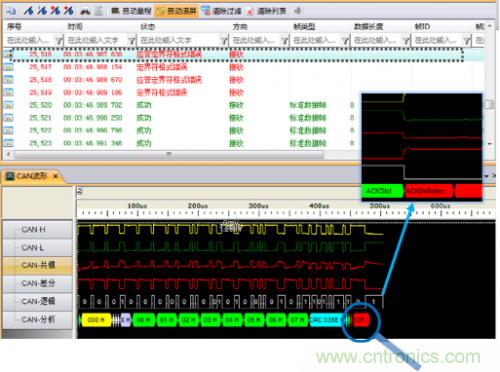 為什么會發生這種錯誤呢?發送報文的節點會在ACK段發送兩個隱性位,若在第一個位期間接收到顯性電平則認為該幀被正確接收。由于仲裁段相同時兩節點都認為自己取得仲裁權,在ACK段等待應答,但該網絡中僅存在兩個節點,因此在ACK段不能收到應答,進而發生應答定界符錯誤。簡單說來這種情形就類似于總線中只有一個節點將不能實現數據發送。圖7是在ACK段有無應答時的波形對比。