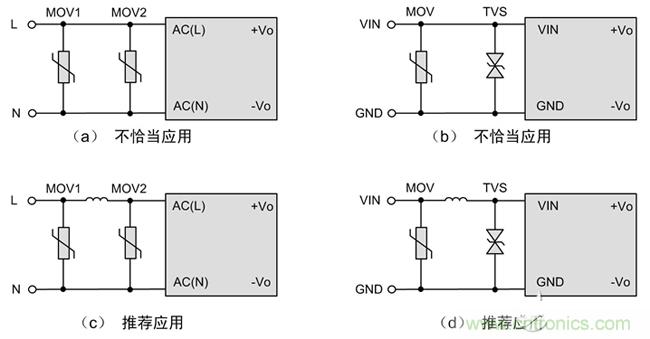 電源模塊體積小,在EMC要求比較高的場(chǎng)合,需要增加額外的浪涌防護(hù)電路,以提升系統(tǒng)EMC性能。如圖1所示,為提高輸入級(jí)的浪涌防護(hù)能力,在外圍增加了壓敏電阻和TVS管。但圖中的電路(a)、(b)原目的是想實(shí)現(xiàn)兩級(jí)防護(hù),但可能適得其反。如果(a)中MOV2的壓敏電壓和通流能力比MOV1低,在強(qiáng)干擾場(chǎng)合,MOV2可能無(wú)法承受浪涌沖擊而提前損壞,導(dǎo)致整個(gè)系統(tǒng)癱瘓。同樣的,電路(b),由于TVS響應(yīng)速度比MOV快,往往是MOV未起作用,而TVS過(guò)早損壞。