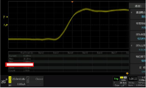 測試電流探頭的上升時間使用的測試儀器是信號發(fā)生器Keysight33600和示波器ZDS2022。信號發(fā)生器產(chǎn)生上升時間為5ns的方波,示波器顯示經(jīng)過電流探頭后的上升波形和時間。