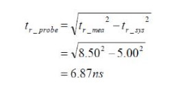 如圖3.1所示,根據(jù)示波器測量到的上升時間為8.5ns,這個總時間是信號發(fā)生器自身的上升時間加上探頭的上升時間,所以實際上探頭的上升時間還需要將總時間減去信號發(fā)生器自身的上升時間,具體的計算公式如下。