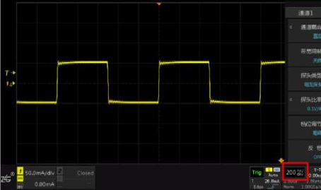 如圖4所示,在測試100KHz的電流方波時,探頭的方波響應(yīng)是很好的,波形基本上沒有畸變,波形比較平坦,沒有發(fā)生傾斜等。