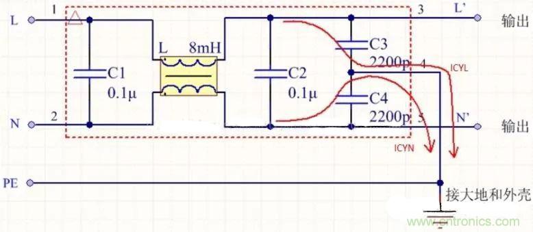 其中兩條紅線是火線和零線N的共模干擾電流回路,稱為漏感電流回路。