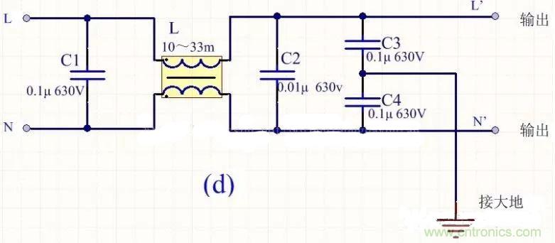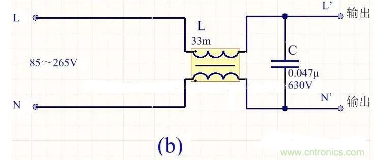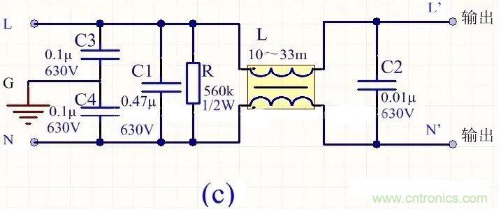 為降低成本和減小體積,開關電源一般采用簡易的EMI濾波器,主要包括共模扼流圈L和濾波電容,以下四種可以根據(jù)情況進行選擇: