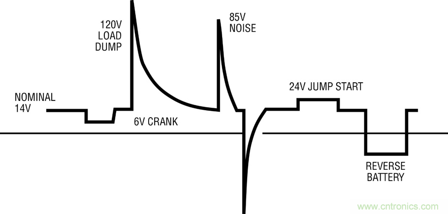 交通運輸系統(tǒng)的輸入電壓可能高達 14V (單電池供電汽車)、28V (雙電池供電卡車、客車和飛機)、或更高電壓,而其數(shù)字系統(tǒng)需要一個或更多個低壓軌。因此,設計這類系統(tǒng)時,需要了解怎樣才能簡便、高效和可靠地從很高的輸入電壓降壓。以下圖 1 顯示,汽車環(huán)境中的輸入電壓可能視其運行狀態(tài)的改變而改變,而其運行狀態(tài)可能包括負載突降變化到冷車發(fā)動的各種情況,甚至出現(xiàn)電池反向連接。