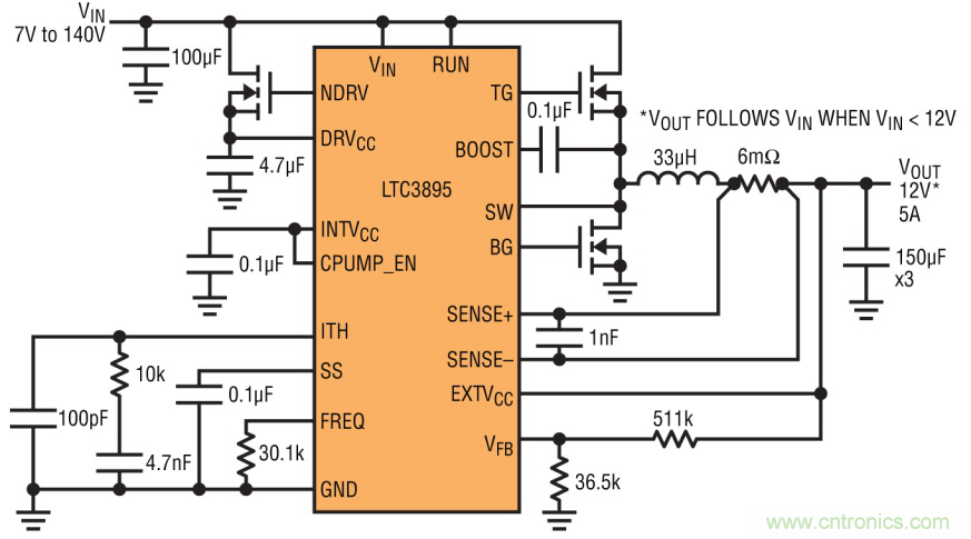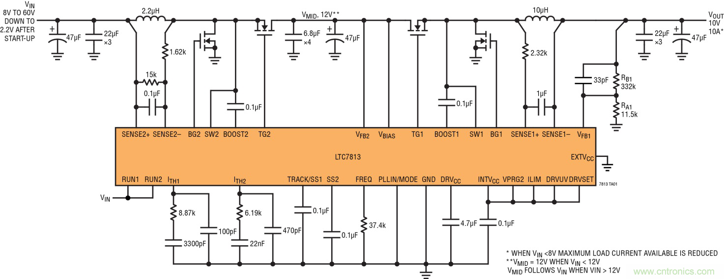 圖 5:LTC7813 原理圖 ~~ 一個級聯(lián)的升壓及降壓型單輸出控制器 IC