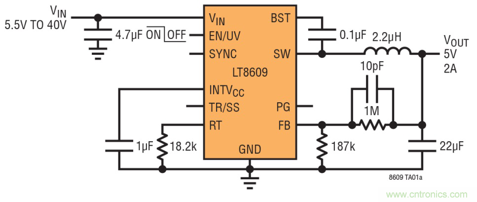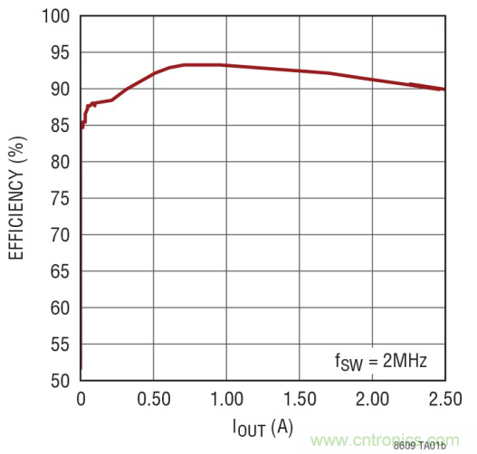 一個很好的例子是 LT8609,這是一款 2A、42V 輸入同步降壓型開關穩(wěn)壓器。獨特的同步整流拓撲提供 93% 的效率,而以 2MHz 頻率切換使設計師能夠避開關鍵噪聲敏感頻段,例如 AM 無線電,同時可提供占板面積非常緊湊的解決方案。突發(fā)模式 (Burst Mode®) 運行在無負載備用情況下保持靜態(tài)電流低于 2.5μA,從而使該器件非常適合始終保持接通的系統(tǒng)。LT8609 的 3.0V 至 42V 輸入電壓范圍使其非常適合汽車應用,這類應用必須以低至 3.0V 的最低輸入電壓穩(wěn)定通過冷車發(fā)動和停-啟情況,并穩(wěn)定通過超過 40V 的負載瞬態(tài)。其內部 3.5A 開關可在峰值負載電流為 3A 時,提供高達 2A 的連續(xù)輸出電流。原理圖和相應于 2MHz 切換頻率的效率曲線如圖 3 所示。