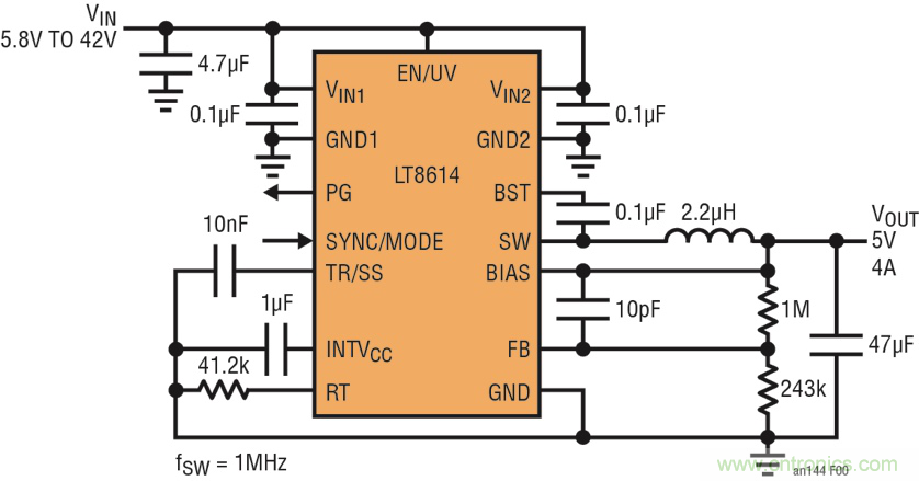 · 高電流密度:采用 3mm x 5mm MSOP 封裝,提供高達 5A 連續(xù)輸出電流