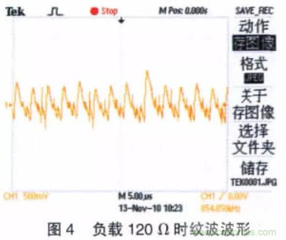 圖3 所示為空載時MAX606 輸出電壓紋波波形(Uo≈12 V),即開關(guān)紋波,其頻率為1.18 kHz,波形穩(wěn)定,Vpp=240 mV。圖4 所示為負載120 Ω 時輸出電壓的紋波波形,從圖4 中可以看出加入負載后電源紋波變得比較復(fù)雜,其最高Vpp達到1.2 V。為系統(tǒng)供電時,該紋波將會對系統(tǒng)造成嚴重危害,必須對此紋波進行抑制。