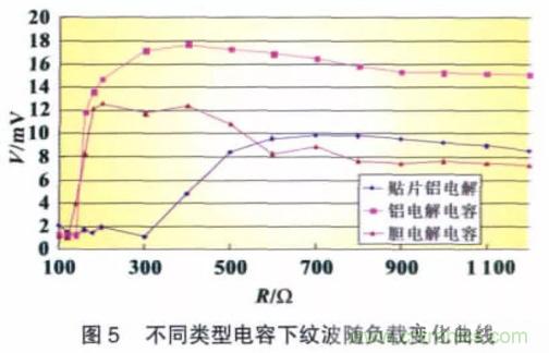 在圖1 的CLC 濾波電路中,Cin、Cout 分別使用三種常見類型的電解電容(容值為220 μF/16 V),電感使用環(huán)形電感(電感值120 μH),依次改變負載大小,使用交流毫伏表測量其紋波電壓有效值,得到如圖5 所示的曲線圖。