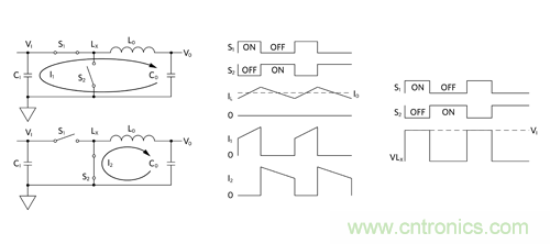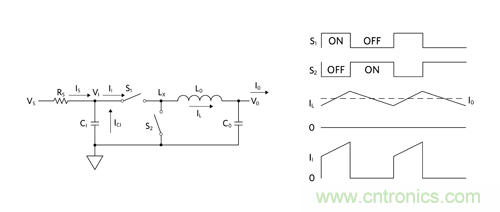 圖 5:Buck 調(diào)節(jié)器原理簡(jiǎn)圖及其工作波形傳導(dǎo) EMI。