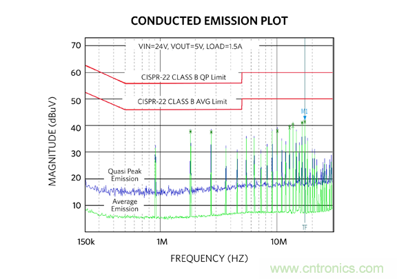 圖 15:MAXM17575 評(píng)估板傳導(dǎo) EMI 測(cè)試結(jié)果。藍(lán)色:準(zhǔn)峰值;綠色:平均值