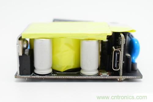 二次側(cè)低壓輸出濾波為兩枚固態(tài)電容,Type-C輸出母座安裝在一塊獨(dú)立PCB小板上。