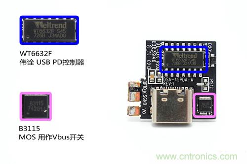 14腳IC為 Weltrend偉詮WT6632F ,來自偉詮的 USB PD控制器,同時(shí)支持QC2.0和QC3.0協(xié)議。粉色框內(nèi)是絲印為 B3115 的貼片MOSFET,用于Vbus開關(guān)。