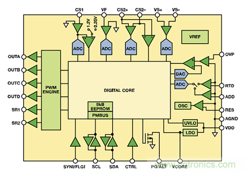 對于數(shù)字控制器來說,所有的控制功能均由數(shù)字邏輯實現(xiàn)。圖3所示為集成PMBus接口的高級數(shù)字控制器ADP1051的功能框圖。該器件非常適合高密度DC-DC電源轉(zhuǎn)換,具有6個可編程脈沖寬度調(diào)制 (PWM) 輸出,可控制大部分高效電源拓撲。另外,該器件還能控制同步整流 (SR),并集成6個模數(shù)轉(zhuǎn)換器 (ADC),能夠采樣模擬輸入電壓、輸入電流、輸出電壓、輸出電流、溫度以及其它參數(shù)。轉(zhuǎn)換為數(shù)據(jù)后,將這些信號發(fā)送至數(shù)字內(nèi)核模塊進行處理。該器件采用靈活的狀態(tài)機架構(gòu),以硬件實現(xiàn)全部功能,提供穩(wěn)定可靠的解決方案,但無法通過編程實現(xiàn)設(shè)計以外的功能。器件的全部功能—包括輸出電壓調(diào)整—均以數(shù)字方式處理。為了調(diào)整輸出電壓,應(yīng)通過PMBus接口發(fā)送一條命令,改變數(shù)字基準電壓值。