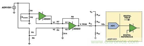 圖5中的電路具有兼容模擬向上或者向下調(diào)壓的功能。兩個電阻分壓器產(chǎn)生兩個基準電壓,其中一個基準電壓表示模擬控制器所需的輸出基準電壓,另一個表示內(nèi)部基準電壓。利用一個電壓跟隨器來避免所需的輸出基準電壓與后續(xù)電路相互影響。利用AD822 FET輸入運算放大器,將所需的輸出基準電壓 (V1) 從模擬控制器的內(nèi)部基準電壓 (V2) 中去除,得到所需的電壓差。此電路的線性放大增益確保了VTRIM足夠大,從而能對VVS+產(chǎn)生影響。