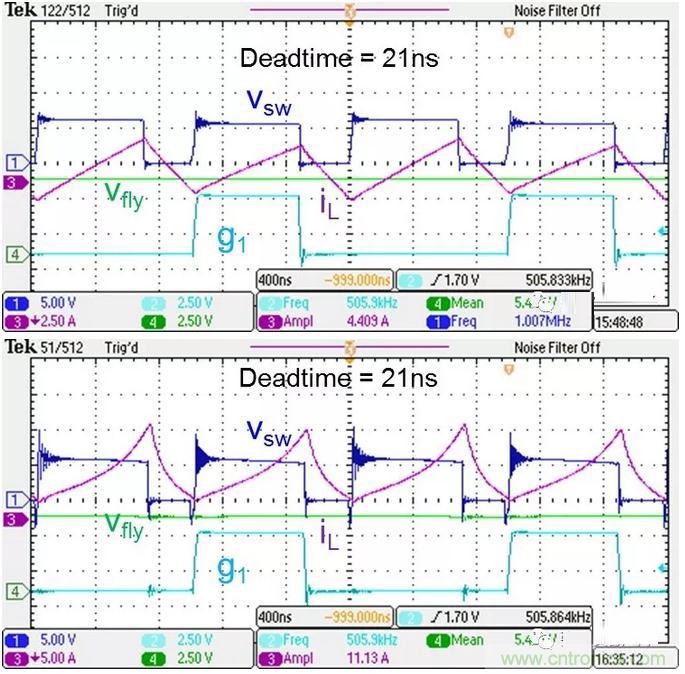 對(duì)于half bridge 實(shí)現(xiàn)ZVS turn on,我們希望當(dāng)上管Q1開啟時(shí)電流是流進(jìn)switching node (vsw)的,也就是圖中電感電流為負(fù)值,當(dāng)下管Q2開啟時(shí)我們希望電流是流出switching node (vsw)的,也就是電感電流為正值。為什么這樣就可以實(shí)現(xiàn)ZVS turn on了呢?我們就看上管Q1開啟過程。如果電感電流iL為負(fù),這時(shí)候我們先關(guān)閉Q2,這時(shí)候Q1還未開啟,在這個(gè)deadtime中iL會(huì)charge Q2的Coss,使Vsw抬高到Vin,當(dāng)然不能超過Vin,因?yàn)镼1的body diode會(huì)導(dǎo)通,鉗位住Vsw到Vin,這時(shí)候Q1的Vds就是Vin-Vsw=0,這時(shí)候我們開啟Q1就實(shí)現(xiàn)ZVS了。同理對(duì)于Q2開啟時(shí),如果電感電流為正,那么當(dāng)我們首先關(guān)閉Q1管時(shí),Vsw就會(huì)被電感電流拉低到0,因?yàn)閕L》0, Q2的Coss會(huì)discharged到0,然后我們?cè)匍_啟Q2,就可以達(dá)到ZVS了。這里我有一張其他Topology的PWM converter的波形圖,也和buck工作原理類似,大概可以看看基本原理,也就是電感電流為負(fù)時(shí),Q1可以實(shí)現(xiàn)ZVS,讓Vsw的ringing比較小。而當(dāng)電感電流為正時(shí),實(shí)現(xiàn)不了ZVS,Vsw的ringing就比較大了。