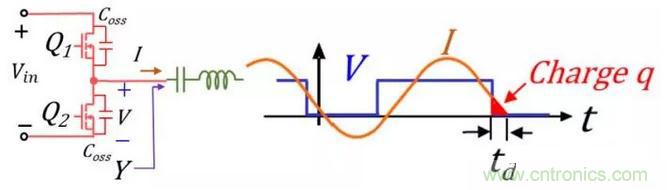這是因?yàn)槿绻娏鱅是滯后與電壓V的,這樣在Q1開啟之前電流I為負(fù)值就會(huì)charge Q2的Coss,同時(shí)discharge Q1的Coss,讓V到Vin,這樣Q1就實(shí)現(xiàn)ZVS turn on了。Q2開啟之前,電流I為正,也會(huì)discharge Q2的Coss,和charge Q1的Coss,讓V到0,這樣Q2就實(shí)現(xiàn)ZVS了。