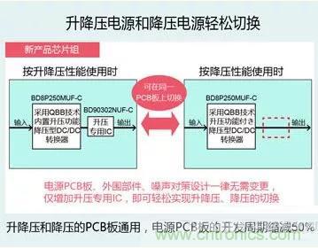 該芯片組融入了Quick Buck Booster技術(shù),從而可實(shí)現(xiàn)以往無法實(shí)現(xiàn)的升降壓電源和降壓電源的電源PCB板、外圍部件、噪聲對(duì)策的通用設(shè)計(jì)。