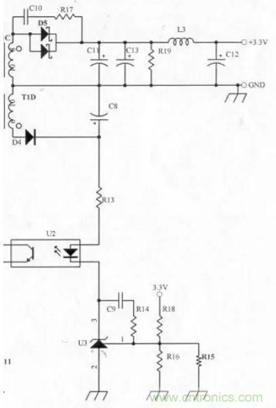 因為輸出電壓為3.3V,而輸出電壓調(diào)整器(Output Voltage Regulator)使用TL431(Vref=2.5V)而非TL432(Vref=1.25V),所以必須多增加一組繞組提供Photo coupler及TL431所需的電源,因為U2及U3所需的電流不大(約10mA左右),二極管耐壓值100V即可,所以只需使用1N4148(0.15A/100V)。