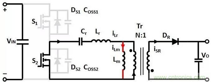 變壓器Lm和Lr的電流從0開始增加,諧振電容Cr充電,沒有能量傳輸?shù)酱渭?jí)的輸出負(fù)載。
