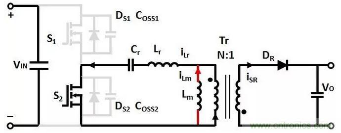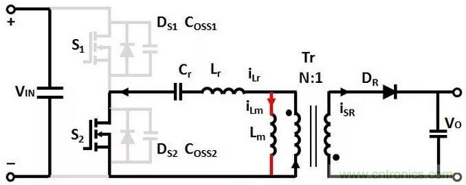 T1時(shí)刻,S1關(guān)斷,(Coss1+Coss2)和(Lr+Lm)諧振,Coss1充電,Coss2放電,直到T2時(shí)刻,Coss1的電壓充電到VIN,Coss2的電壓放電到0。