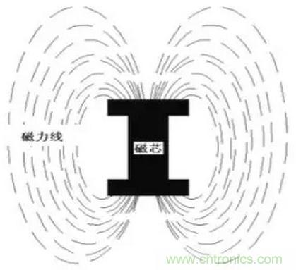 正如上所指,對(duì)于一個(gè)開環(huán)磁路的電感(以工字電感為例),其磁力線的主磁路是空氣。如圖1。