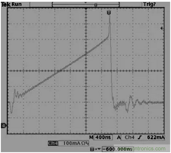 32.反激拓補結構,變壓器B值需小于3500高斯,如果變壓器飽和一切動作將會失控,如下,上圖為正常,下圖為飽和。