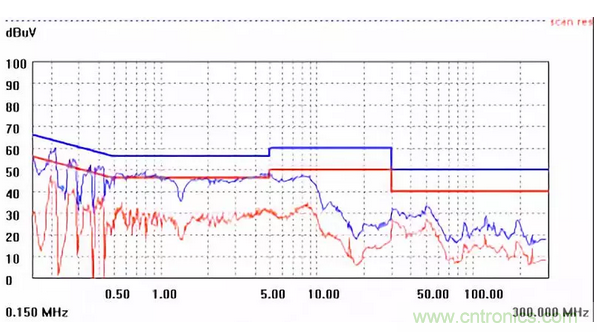 圖一a可以看出,改變PCB布局后130M-200M已經完全被衰減,但是30-130M沒有圖一效果好,可能變壓器出線無交叉好一些。仔細觀察,此IC具有抖頻功能,傳導部分頻段削掉了一些尖峰;