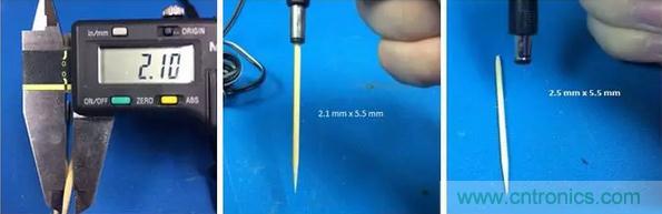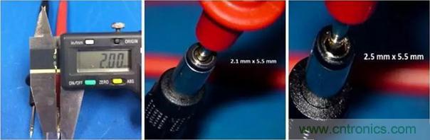 顯然,用一把尺子或者游標(biāo)卡尺(如果手邊有的話)來準(zhǔn)確測量或辨別2.1mm或者2.5mm的小孔內(nèi)徑是很難的。這就留給我們兩個選擇: