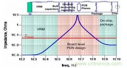 在調試該故障前先回顧下電源噪聲抑制的原理。如下圖所示,電源分配網絡中不同的頻段由不同的元件來抑制噪聲,去耦元件包含電源調整模塊(VRM)、去耦 電容、PCB電源地平面對、器件封裝和芯片。VRM包含電源芯片及外圍的輸出電容,大約作用于DC到低頻段(100K左右),其等效模型是一個電阻和一個 電感組成的二元件模型。去耦電容最好使用多個數量級容值的電容配合使用,充分覆蓋中頻段(數10K到100M左右)。由于布線電感和封裝電感的存在,即時 大量堆砌去耦電容也難以在更高頻起到作用。PCB電源地平面對形成了一個平板電容,也具有去耦作用,大約作用在數十兆。芯片封裝和芯片負責高頻段 (100M以上),目前的高端器件一般會在封裝上增加去耦電容,此時PCB上的去耦范圍可以降低到數十兆甚至幾兆。因此,在電流負載不變的情況下,我們只 要判斷出電壓噪聲出現在哪個頻段,那么針對這個頻段所對應的去耦元件進行優(yōu)化即可。在兩個去耦元件的相鄰頻段時兩個去耦元件會配合作用,所以在分析去耦元 件臨界點時相鄰頻段的去耦元件也要同時納入考慮。
