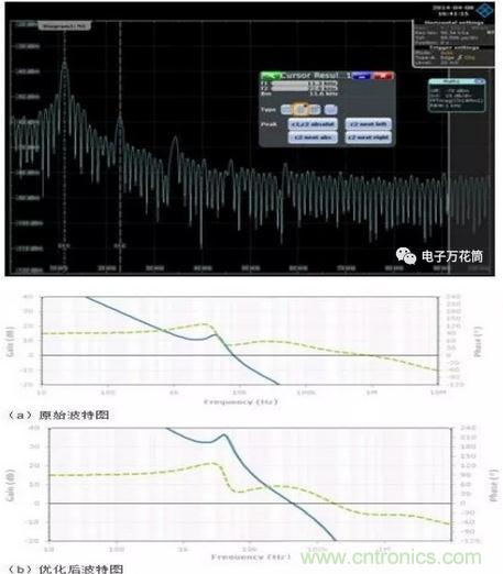 一般來說,11.3KHz應該是VRM的管轄范圍,此處出現較大噪聲說明VRM電路設計不能滿足 要求。這里對VRM的性能進行分析,VRM分析的方法眾多,此處主要采用仿真其反饋環(huán)路波特圖的手段。波特圖主要觀察幾個關鍵信息:1、穿越頻率,增益曲 線穿越0dB線的頻率點;2、相位裕度,相位曲線在穿越頻率處所對應的相位值;3、增益裕度,相位在-360°時所對應的增益值。這里我們主要關注穿越頻 率和相位裕度這兩個指標。從VRM的環(huán)路波特圖(如下圖a)可以看到,VRM的穿越頻率在8KHz左右,相位裕度37度。這里存在兩個問題:首先VRM的 相位裕度一般需要大于45度才能保證環(huán)路的穩(wěn)定工作,這里相位裕度稍小一些,需要增加相位裕度;其次穿越頻率太低,穿越頻率附近VRM的調整作用逐漸降低,而此頻點bulk電容還起不到作用,所以在8KHz附近會存在較高的阻抗,這個頻點的噪聲抑制作用較差。下圖(b)是優(yōu)化VRM環(huán)路之后的波特圖,調整相位裕度到50度,穿越頻率推到46KHz左右。