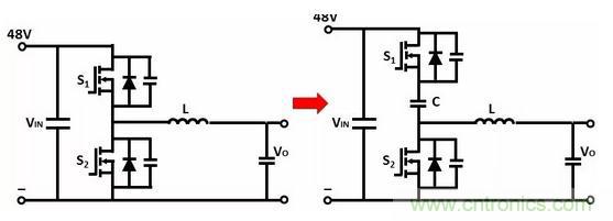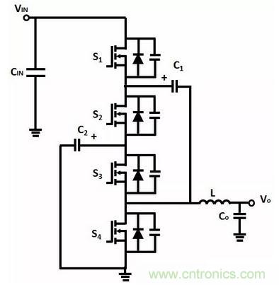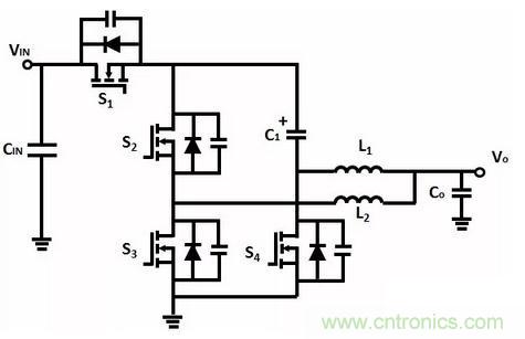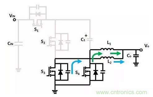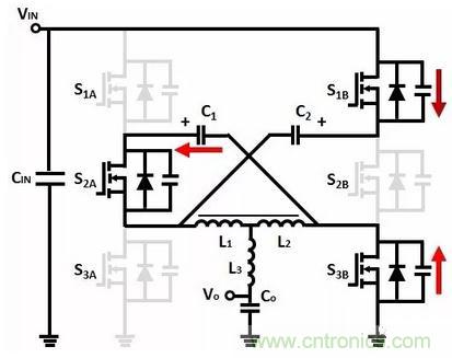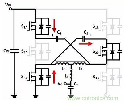 如果C1、C2的電容相等,電感電流等于電容C1、C2的電流之和。S1、S3工作于硬開關(guān)狀態(tài),由于S1、S3的電流降低,因此可以同時(shí)降低導(dǎo)通損耗和開關(guān)損耗。