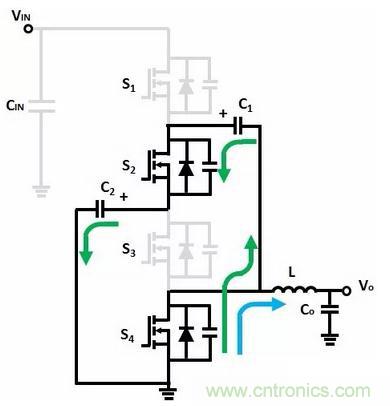 L1激磁,輸入電壓通過C1向輸出負(fù)載提供能量,同時(shí)對C1充電; L2去磁,S4續(xù)流。