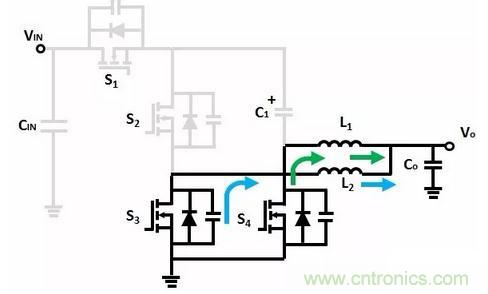輸出電感去磁,在前面一個(gè)階段過程結(jié)束時(shí),由于C1、C2的電壓不平衡,當(dāng)S2、S4導(dǎo)通后,將C1、C2并聯(lián),所以電壓高的電容將會對電壓低的電容放電,那么,S4不僅流過輸出電感續(xù)流電流,還要流過C1、C2充放電的電流,因此其導(dǎo)通損耗會增加。
