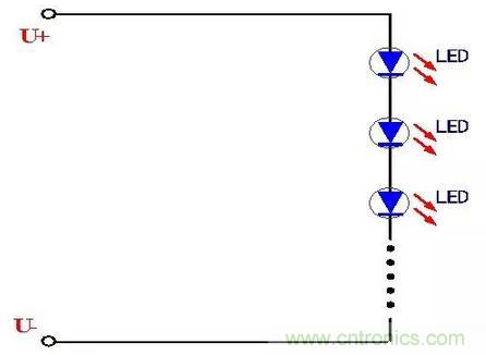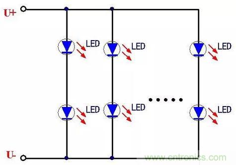 這種串聯連接的方式電路比較簡單,首尾連接在一起,LED工作時流過的電流一致很好,由于LED屬于電流型器件,因此基本可以保證每個LED的發光強度一致。采取這種LED連接方式的電路簡單、連接方便。但是也有一個致命的缺點,那就是當其中一個LED發生開路故障時,將造成整個LED燈串的熄滅,影響了使用的可靠性,這就需要保證每個LED的質量過硬,這樣可靠性也就相應的提高。