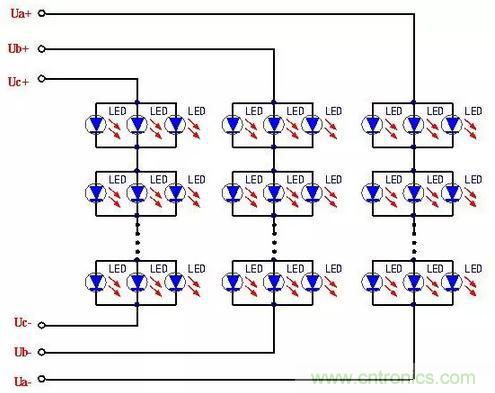 陣列方式主要構成形式是:分支以3個LED為一組,分別接入驅動器輸出的Ua,Ub,Uc輸出端。當一分支中的3個LED都正常時,3個LED同時發光;一旦其中有一個或兩個LED失效開路時,可以保證至少有一個LED的正常工作。這樣一來就能夠大大地提高了每組LED發光的可靠性,也就能夠提高整個LED發光的總體可靠性。采用這種方式需要多組輸入電源,目的是為了提高LED 工作的可靠性,降低整體電路故障發生率。