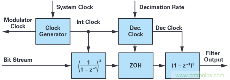 傳統(tǒng)的三階sinc濾波器如圖1所示。濾波器通過按比例縮放系統(tǒng)時鐘來生成ADC的調制器時鐘,而ADC則向濾波器返回一個1位數(shù)據(jù)流。濾波器功能本身包括三階級聯(lián)積分器 1/(1 – z–1)(時鐘速率與調制器速率相同)和三階級聯(lián)微分器 1 – z–1(時鐘速率為抽取時鐘)。