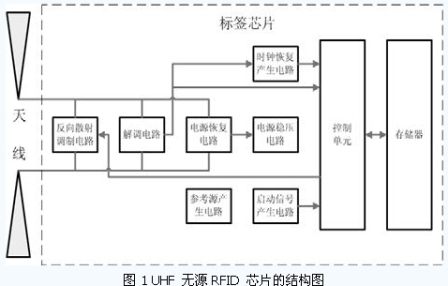 如圖1 所示,一個完整超高頻無源RFID 標簽由天線和標簽芯片兩部分組成,其中,標簽芯片一般包括以下幾部分電路:電源恢復電路、電源穩壓電路、反向散射調制電路、解調電路、時鐘提取/產生電路、啟動信號產生電路、參考源產生電路、控制單元、存儲器。