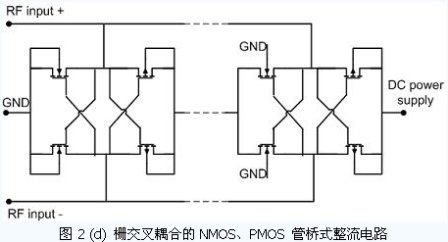 在這些電源恢復電路中,并不存在最理想的電路結構,每種電路都有各自的優點及缺陷。在不同的負載情況、不同的輸入電壓情況、不同的輸出電壓要求以及可用的工藝條件下,需要選擇不同的電路以使其達到最優的性能。圖2(a)所示的多級二極管倍壓電路,一般采用肖特基勢壘二極管。它具有倍壓效率高、輸入信號幅度小的優點,應用十分廣泛。但是,一般代工廠的普通CMOS 工藝不提供肖特基勢壘二極管,在工藝的選擇上會給設計者帶來麻煩。圖2(b)是用接成二極管形式的PMOS 管來代替肖特基二極管,避免了工藝上的特殊要求。這種結構的倍壓電路需要有較高的輸入信號幅度,在輸出電壓較高時具有較好倍壓效率。圖2(c)是傳統的二極管全波整流電路。與Dickson 倍壓電路相比,倍壓效果更好,但引入了更多的二極管元件,功率轉換效率一般略低于Dickson 倍壓電路。另外,由于它的天線輸入端與芯片地分離,從天線輸入端向芯片看去,是一個電容隔直的全對稱結構,避免了芯片地與天線的相互影響,適合于與對稱天線(例如偶極子天線)相接。圖2(d)是許多文獻提出的全波整流電路的CMOS 管解決方案。在工藝受限的情況下,可以獲得較好的功率轉換效率,并且對輸入信號幅度的要求也相對較低。