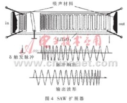 擴展器的原理圖如圖4所示。主要由壓電晶片(這里采用了LiTaO3晶體)和光刻在其表面上的叉指換能器組成。觸發脈沖輸入換能器后,由逆壓電效應激勵出聲表面波。傳播到輸出換能器后,由壓電效應轉換成與叉指條周期一一對應的電磁波。由于聲表面波到達換能器時間上的差異,得到了一組頻率按線性變化的展寬電脈沖。