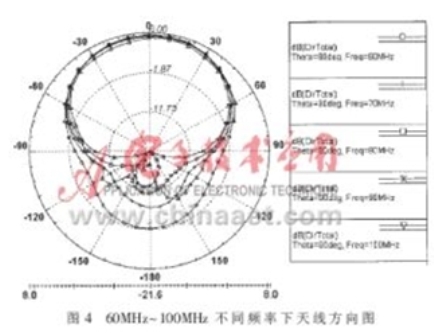 圖3為f=70MHz時天線的二維方向圖,從中可以看出,天線方向性系數達到7dB左右,而利用文獻中的圖表所查到方向性系數為6.5dB。圖4給出了幾個頻率下天線的二維方向圖,可以看出,各個頻率下方向圖形狀大致相同,但隨著頻率越靠近頻率范圍的上下限、方向圖背瓣越大。