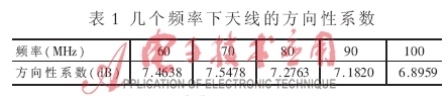 為了更形象地描述天線的方向性,軟件可以給出三維方向圖。頻率為60MHz和90MHz時天線的三維方向圖如圖5所示。表1給出天線的方向性系數 。