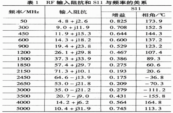 在400 MHz低頻處或3.7GHz處,RF輸入匹配網(wǎng)絡(luò)在原有基礎(chǔ)上增加并聯(lián)電容器C5,如果450MHz下的輸入匹配電容器C5的容值為12 pF,在評(píng)估板的50 Ω輸入傳輸線上,位于距離引腳34.5 mm的位置;900 MHz下的輸入匹配電容C5=3.9 pF,位于距離引腳3 1.3 mm的位置;3.5 GHz下的輸入匹配電容器C5=O.5 pF,位于距離引腳34.5mm的位置。這種串聯(lián)傳輸線/并聯(lián)電容器匹配拓?fù)涫沟肔T5527可用于倍頻標(biāo)準(zhǔn),而不需要修正電路板的設(shè)計(jì)。串聯(lián)傳輸線可用串聯(lián)的片式電感器代替,以使布局更簡(jiǎn)單。RF輸入阻抗和Sl1與頻率的關(guān)系(沒(méi)有外部匹配)列于表1。S11數(shù)據(jù)用于微波電路模擬設(shè)計(jì)自定義匹配網(wǎng)絡(luò),模擬和RF輸入濾波器的接口連接。