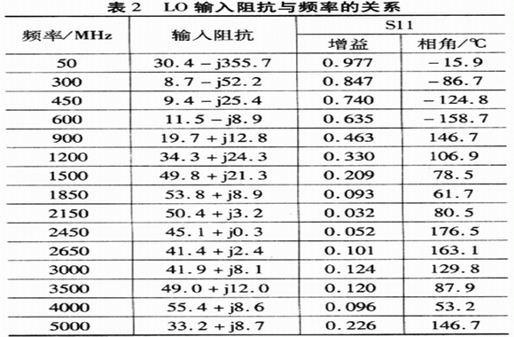 頻率大于1.2 GHz時(shí),盡管放大器提供的功率有幾個(gè)dB,但最佳LD驅(qū)動(dòng)功率只有-3 dBm(I/0輸入功率變化,混頻器性能不變);在頻率低于1.2GHz的情況下,盡管-3 dBm的L0驅(qū)動(dòng)功率仍然提供高轉(zhuǎn)化增益和線性,但是為了得到最佳噪聲,LO驅(qū)動(dòng)功率為0 dBm。自定義匹配網(wǎng)絡(luò)的阻抗數(shù)據(jù)見(jiàn)表2,并參考LO端沒(méi)有匹配時(shí)的情況。